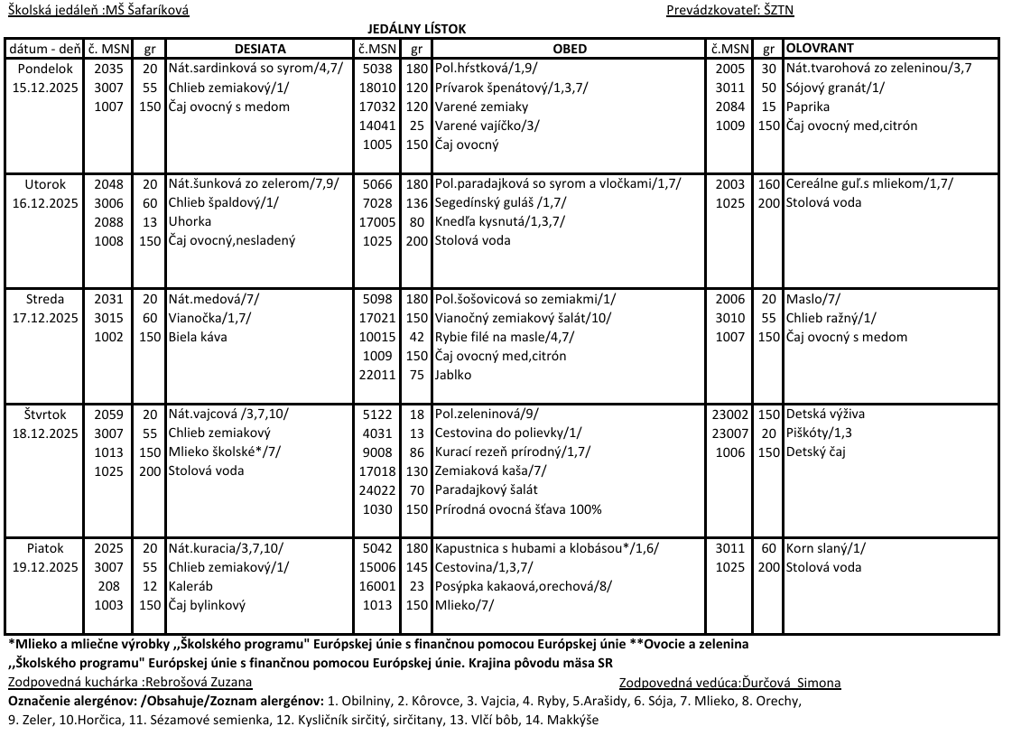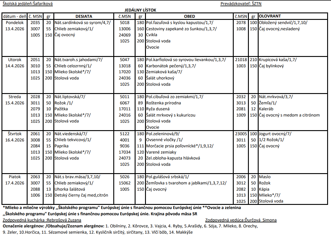 Jedálny lístok Šafárikova